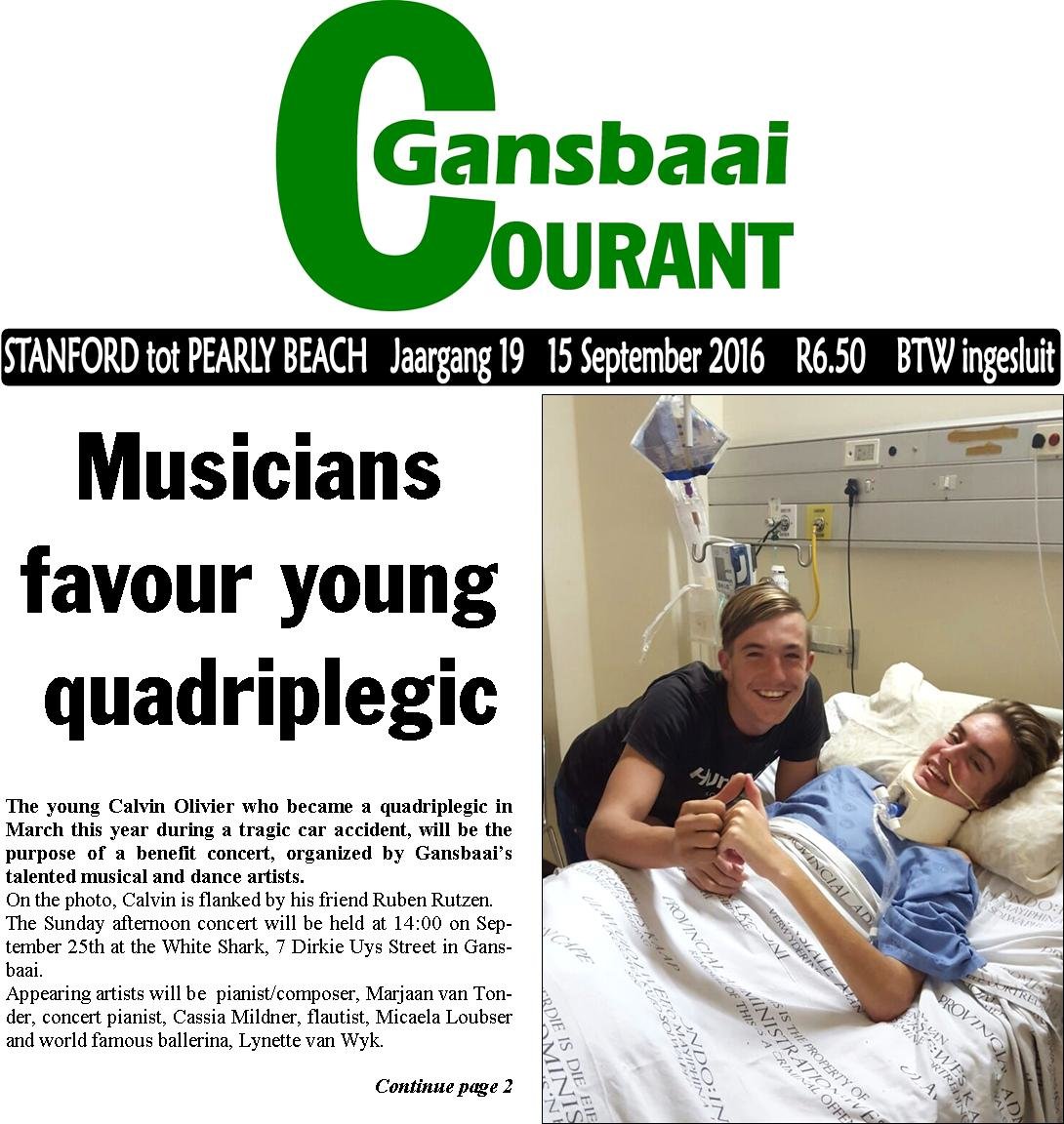 The young Calvin Olivier who became a quadriplegic in March this year during a tragic car accident, will be the purpose of a benefit concert, organized by Gansbaai’s talented musical and dance artists.