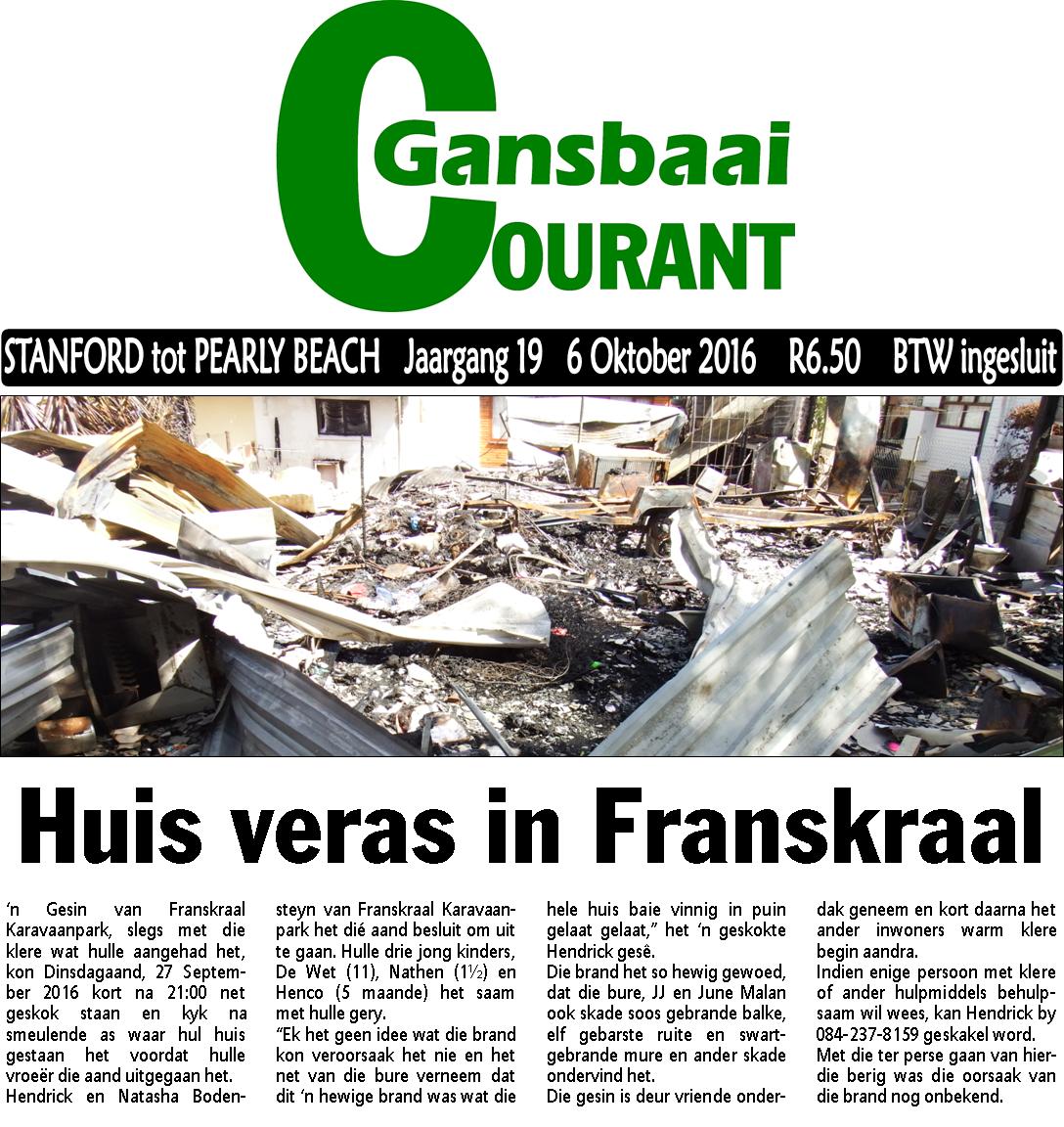 ‘n Gesin van Franskraal Karavaanpark, slegs met die klere wat hulle aangehad het, kon Dinsdagaand, 27 September 2016 kort na 21:00 net geskok staan en kyk na smeulende as waar hul huis gestaan het voordat hulle vroeër die aand uitgegaan het.