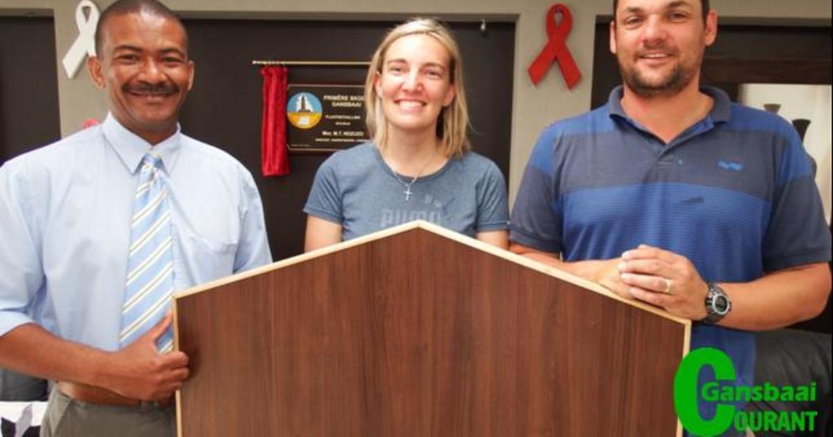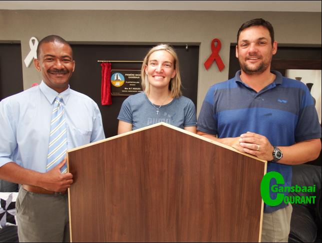 Van links staan Tommy Volkwyn (skoolhoof), Melissa Doyle (onderwyser) en André Hage.