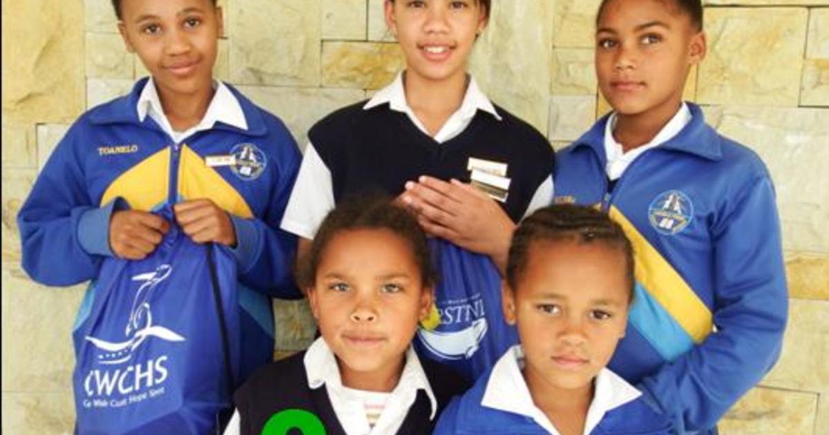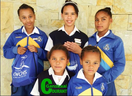 Hulle is voor van links Lameez Pietersen (Gr 2) en Cassidy Jacobs (Gr 1). En agter Tsoanelo Haarhoff Haarhoff (Gr 5, R100 geskenkbewys), Kaylin Robertson (Gr 7, R500 geskenkbewys) en Shanique Baartman (Gr 5).