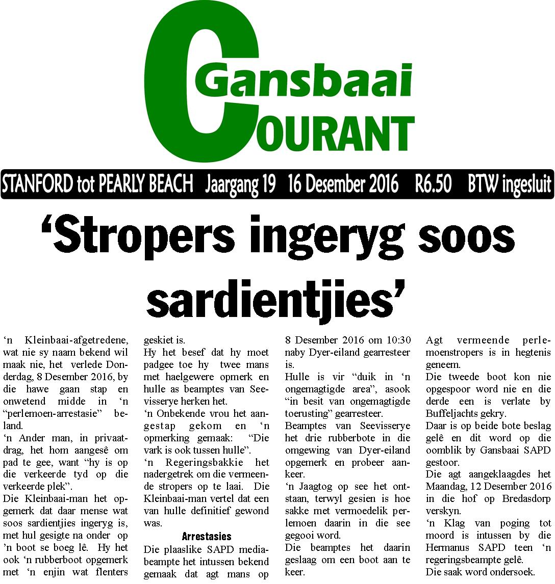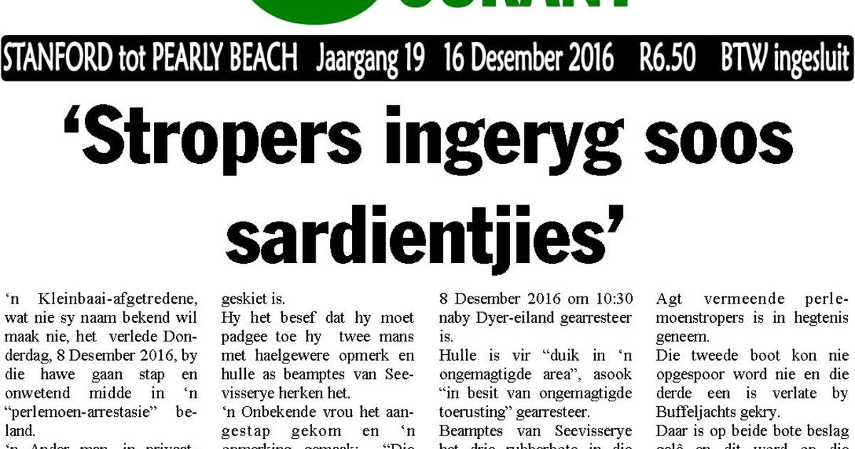 ‘n Kleinbaai-afgetredene, wat nie sy naam bekend wil maak nie, het verlede Donderdag, 8 Desember 2016, by die hawe gaan stap en onwetend midde in ‘n “perlemoen-arrestasie” beland.