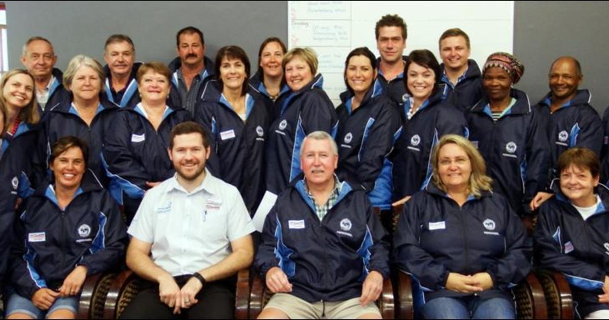 Jolette Bezuidenhout, Eric Haxton, Wynand Bezuidenhout, Bertie le Roux, Jolandi Oosthuizen, Hannes Grobler en Joathan Doyle. Middel: Marlette Longland, Elna le Roux, Susan Cilliers, Riva van der Merwe, Carina Brown, Jolinda Avenant, Lyndri Kotze, Rose Ncgabashe, Kenny Marthinus en Annette Wessels.