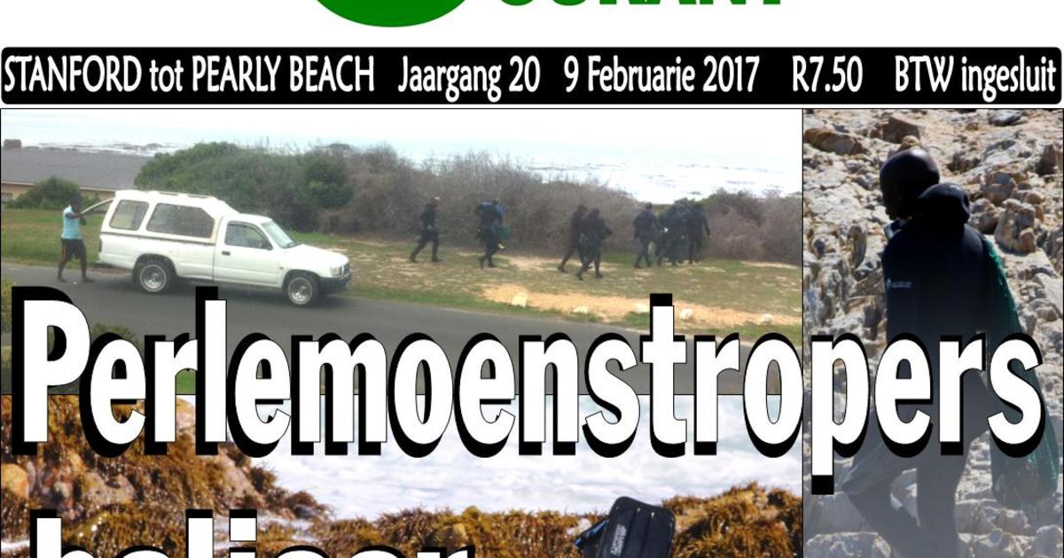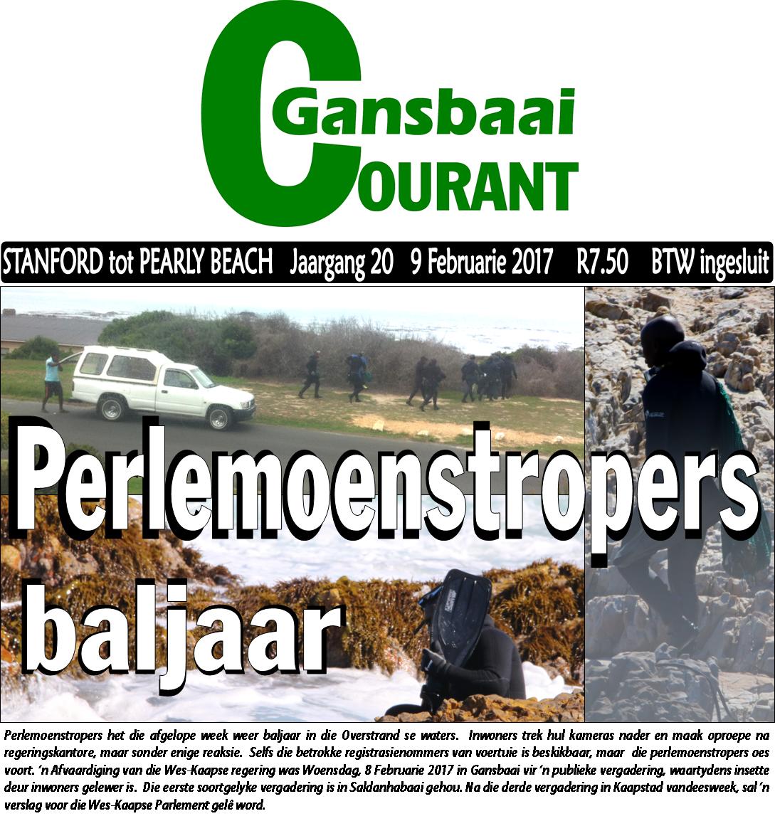 Perlemoenstropers het die afgelope week weer baljaar in die Overstrand se waters. Inwoners trek hul kameras nader en maak oproepe na regeringskantore, maar sonder enige reaksie. Selfs die betrokke registrasienommers van voertuie is beskikbaar, maar die perlemoenstropers oes voort. ‘n Afvaardiging van die Wes-Kaapse regering was Woensdag, 8 Februarie 2017 in Gansbaai vir ‘n publieke vergadering, waartydens insette deur inwoners gelewer is. Die eerste soortgelyke vergadering is in Saldanhabaai gehou. Na die derde vergadering in Kaapstad vandeesweek, sal ‘n verslag voor die Wes-Kaapse Parlement gelê word.