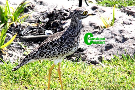 ‘n Gespikkelde dikkoppie (spotted thick-knee), Burhinus capensis, wat hou van reg en geregtigheid.