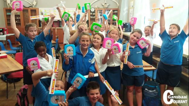 Opgewonde leerders van die Laerskool Gansbaai was in hul skik met die kleurvolle kosblikke en liniale wat hulle ontvang het. Desiree van Zyl, Bestuurder van Mr Video, Gansbaai het Vrydag, 17 Februarie, 90 kosblikke en 145 liniale aan die leerders uitgedeel.