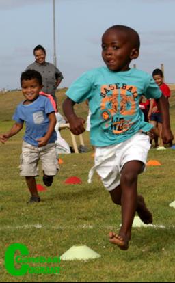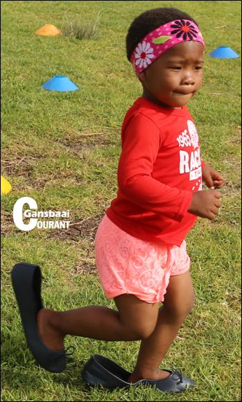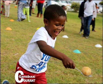 Juwayne Robertson neem hier deel aan ‘n naelloop-item. Hy het homself bewys as ‘n uitstekende deelnemer met ‘n ware sportmangees. Die kleingoed se sportdag was ‘n goeie inleiding vir hierdie naweek se sportfees wat deur die Overstrand Munisipaliteit op Gansbaai se sportgronde aangebied word.