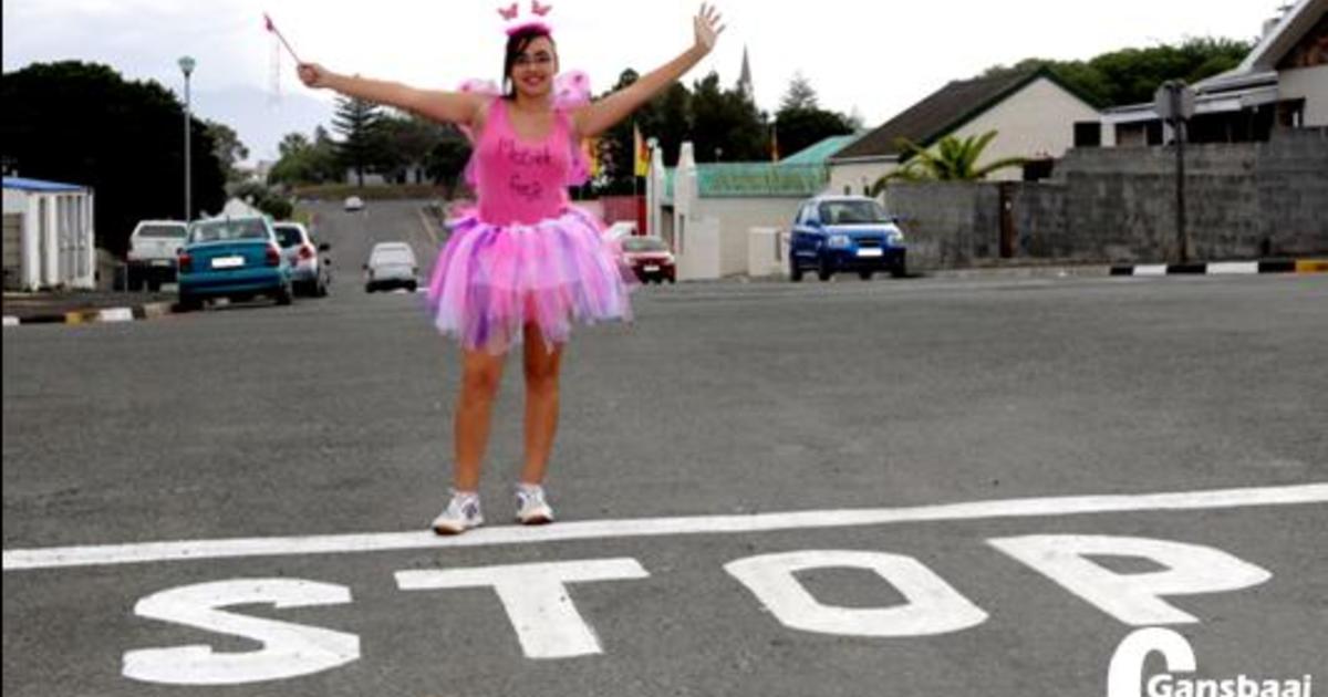 Stop-stop - ek is ‘n matriekfeetjie! Elisma Smit is een van Gansbaai Academia se matriekleerlinge wat Saterdag ons dorp se hoofstraat gaan opvrolik met dié skool se blikkieskudprojek ten bate van die matriekfonds.