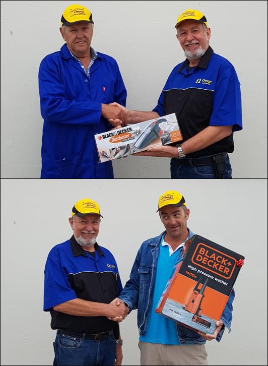 Foto bo: Freddie Engelbrecht (links) ontvang ‘n hoëdruk-spuit wat hy in ‘n kompetisie by Omega Hardeware gewen het.