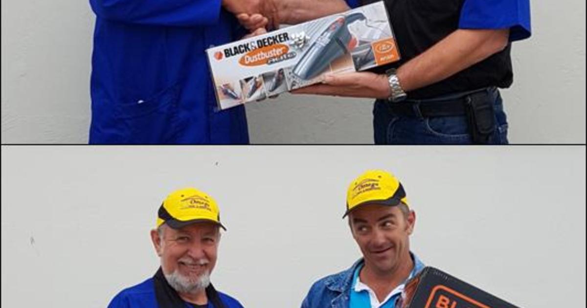 Foto onder: Wayne Reich (regs) het die tweede prys gewen en neem sy motorstofsuier in ontvangs. In beide foto’s oorhandig Kobus van Staden, die eienaar, dit aan die wenners.