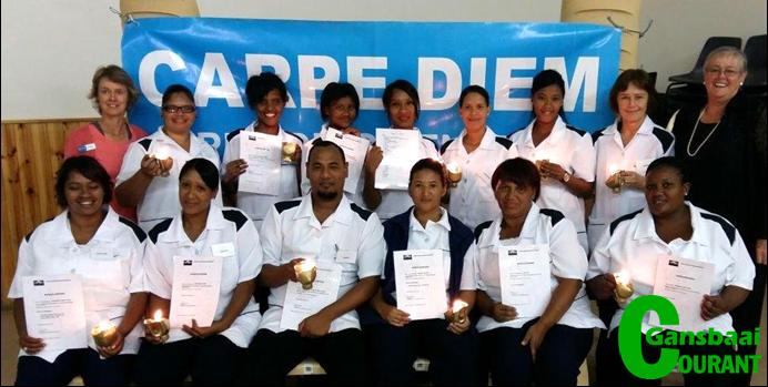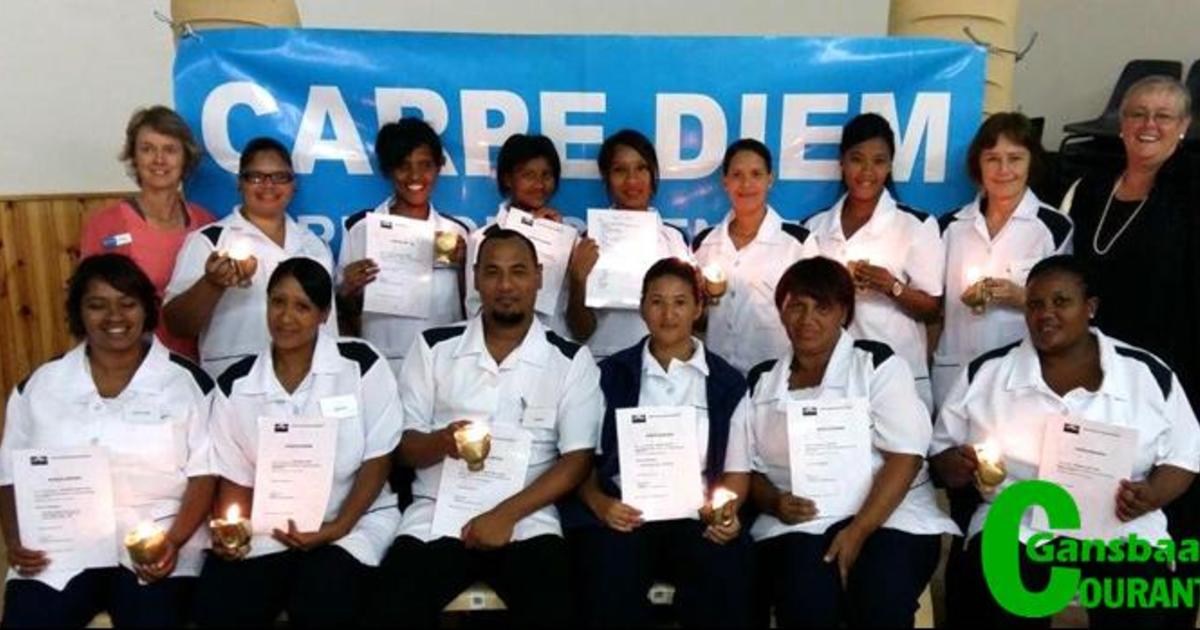 Op die foto ontvang die suksesvolle studente hul sertifikate van Elnette du Toit, area bestuurder van Kansa (links agter). Die studente is voor van links: Preseine Africa (hoogste lof toekenning), Shimonnay Visser, Denzil Ceasar, Natalie Pieterse, Andy Dyk en Aida Letsie. Agter van links: Elnette du Toit (spreker), Yolandie Jansen, Elwida Europa, Sharon Jantjies, Joynaline Marthinnus, Ronelda Barends, Mariégen Swart, Barbara Martins (hoogste lof toekenning) en Iréne de Waal (geregistreerde verpleegkundige en opleier).