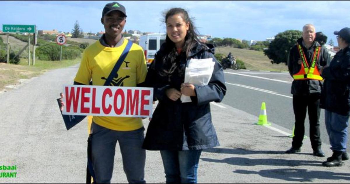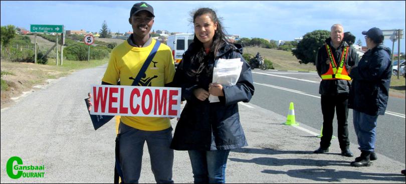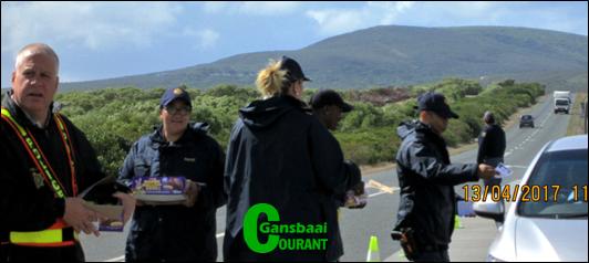 Na ‘n lang, besige pad na Gansbaai, is vakansiegangers verlede Donderdag verras met ‘n ‘vriendelike’ padblokkade by die De Kelders ingang. Lede van Gansbaai Toerisme en Gansbaai Polisiëringsforum (GPF), in samewerking met die plaaslike SAPD, het verbaasde motoriste welkom geheet met paaseiers, brosjures met spesiale aanbiedinge in die omgewing, ‘n Gansbaai Courant en veiligheidswenke.