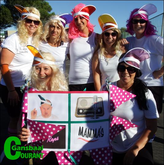 ‘n Groep netbalspelers van Laerskool Gansbaai se Mamma's het Vrydag, 21 April 2017 ingespring om te help met die dogters se “geesvangdag”. Hulle het, met pruike en al aan netbalwedstryde deelgeneem om hul staal te wys. Voor vlnr is Deidré du Toit en Marchelle Mostert. Agter vlnr Tanja Fourie, Jaunene Otto, Tania Lourens, Marietta Uys en Anjé Badenhorst.
