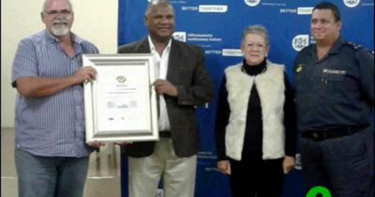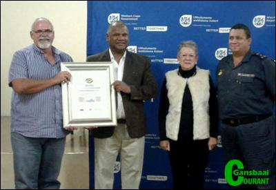 Vlnr is John Galvin, ('n Buurtwaglid) wat die sertifikaat namens Franskraal Buurtwag van minister Dan Plato in ontvangs geneem het. Langs hulle staan Lucille Mangiagalli (Polisiëringsforum) en Brig Heilbron.