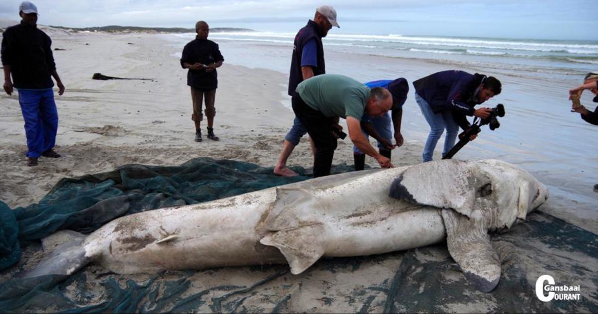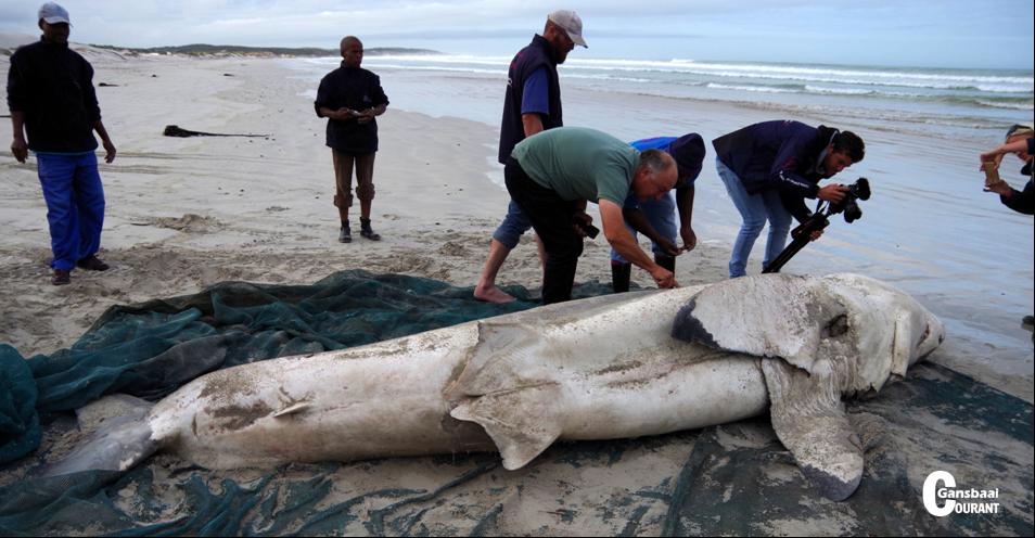 “This is the 5th white shark carcass, and the largest to wash up in Gansbaai since 2012,” says Alison Towner, white shark biologist for the Dyer Island Conservation Trust. “On Wednesday, 3 May 2017 at 07:00 a deceased white shark was reported at the beach in Franskraal.”