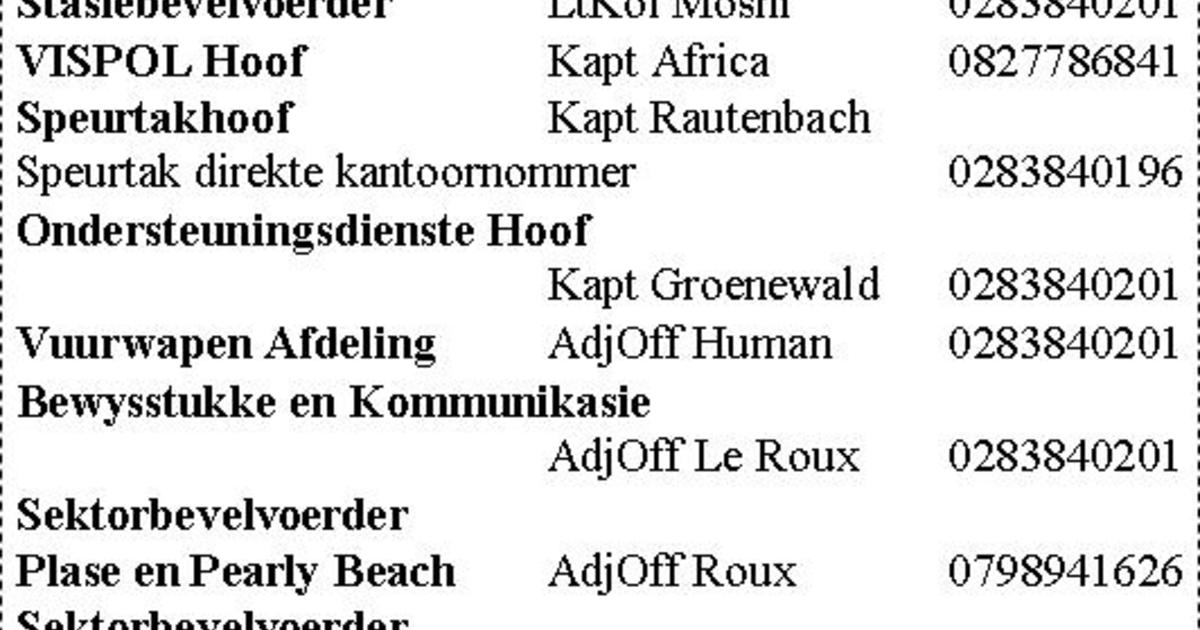 Enige probleme wat ondervind word, onder die aandag van die VISPOL Hoof gebring word. Die volgende kontaknommers is beskikbaar gestel: