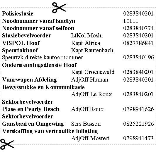 Die volgende inligting is deur Gansbaai SAPD se mediabeampte, Adj-off Wynand Le Roux verskaf: