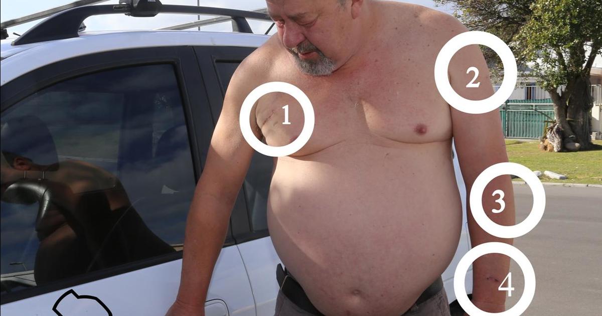 Hy het instinktief sy beseerde linkerbors vasgedruk om die bloed te probeer stop en hom teen die aanval te verweer en is nog 4 keer in sy regterarm gesteek.