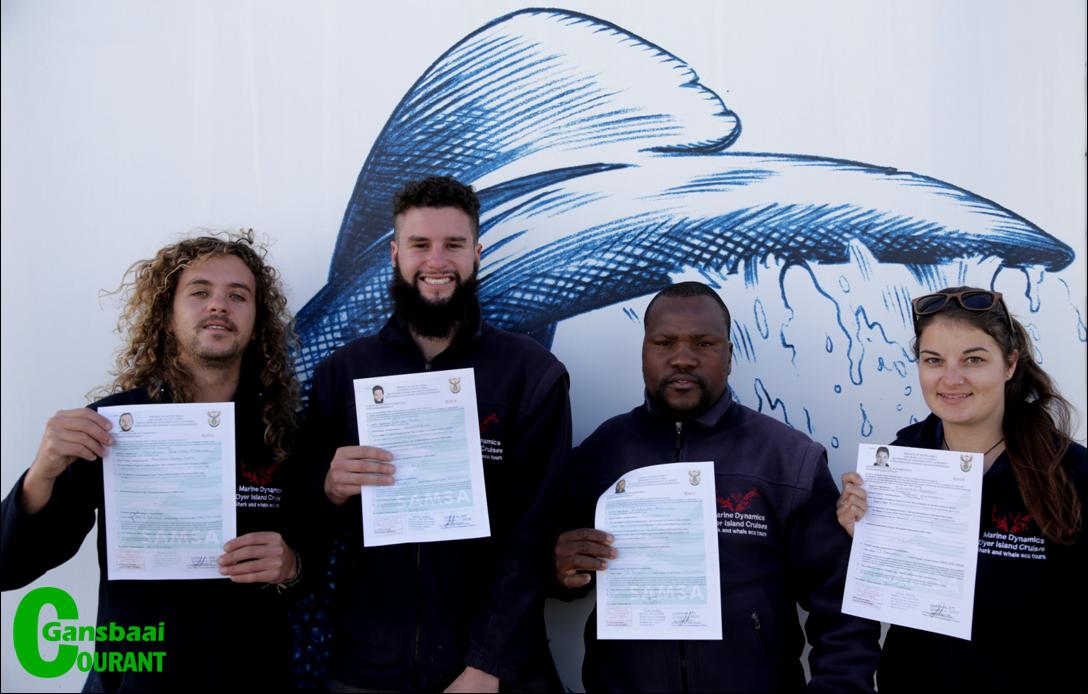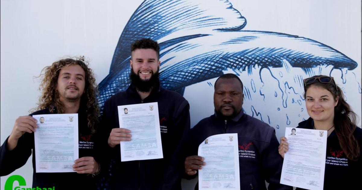 Marine Dynamics is proud to have four new skippers on the team. All four passed their Day Skipper’s Category C vessel <9m rating for a distance of 15 nautical miles from shore. The team includes the two co-coordinators from the International Marine Volunteer Programme. Photo - from left : Hennie Odendaal and Ettiene Roets; whale guide Kira Matiwane and Marine Biologist Sandra Hoerbst.