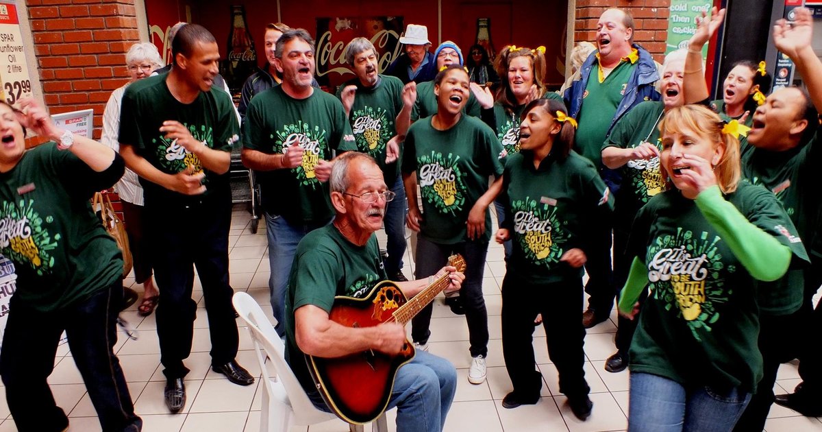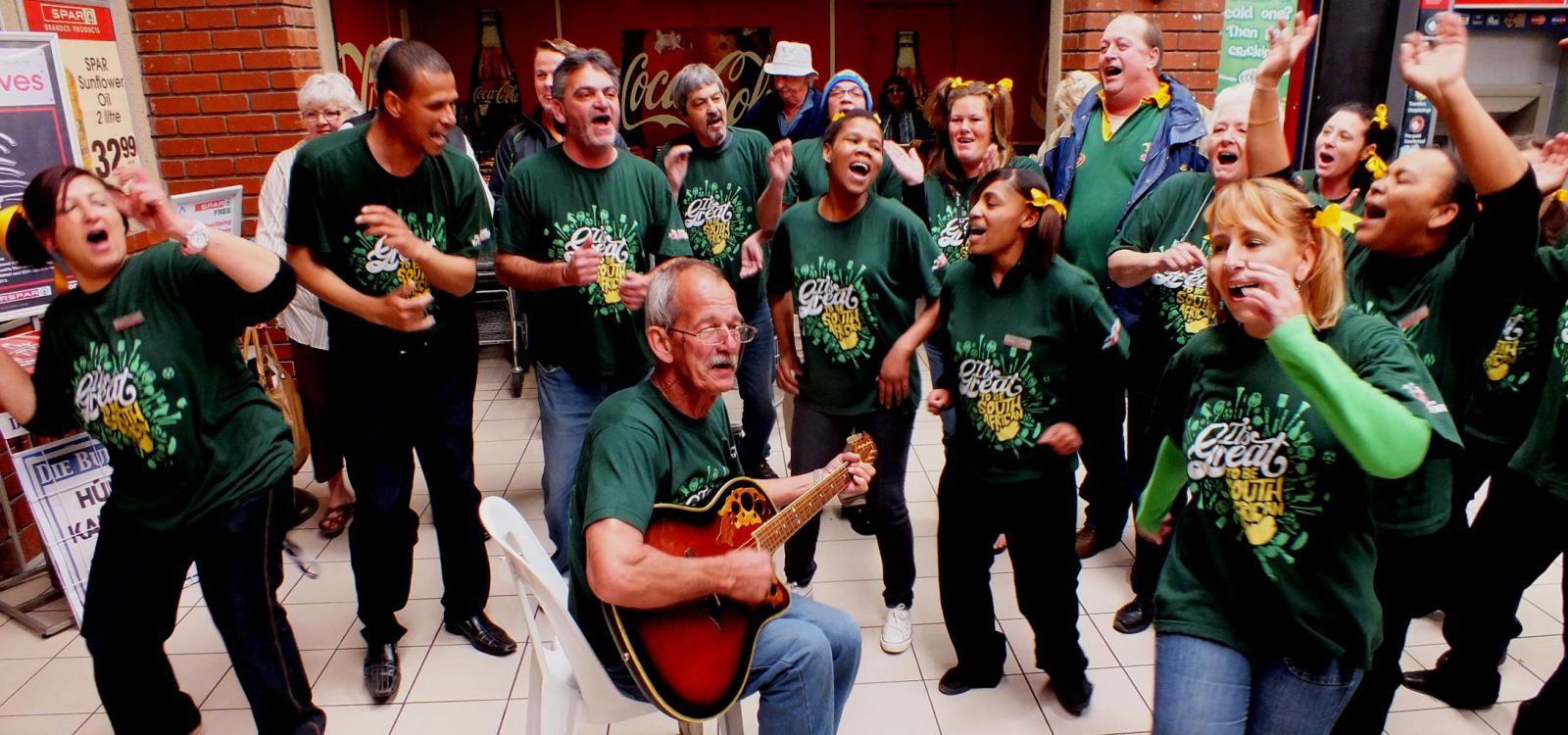 ‘n Deel van Gansbaai Superspar se personeel besig om te dans en te sing saam met Jurie Crous se kitaarmusiek tydens ‘n “It’s Great to be South African” pretdag in die winkel Foto: Francois de Jongh