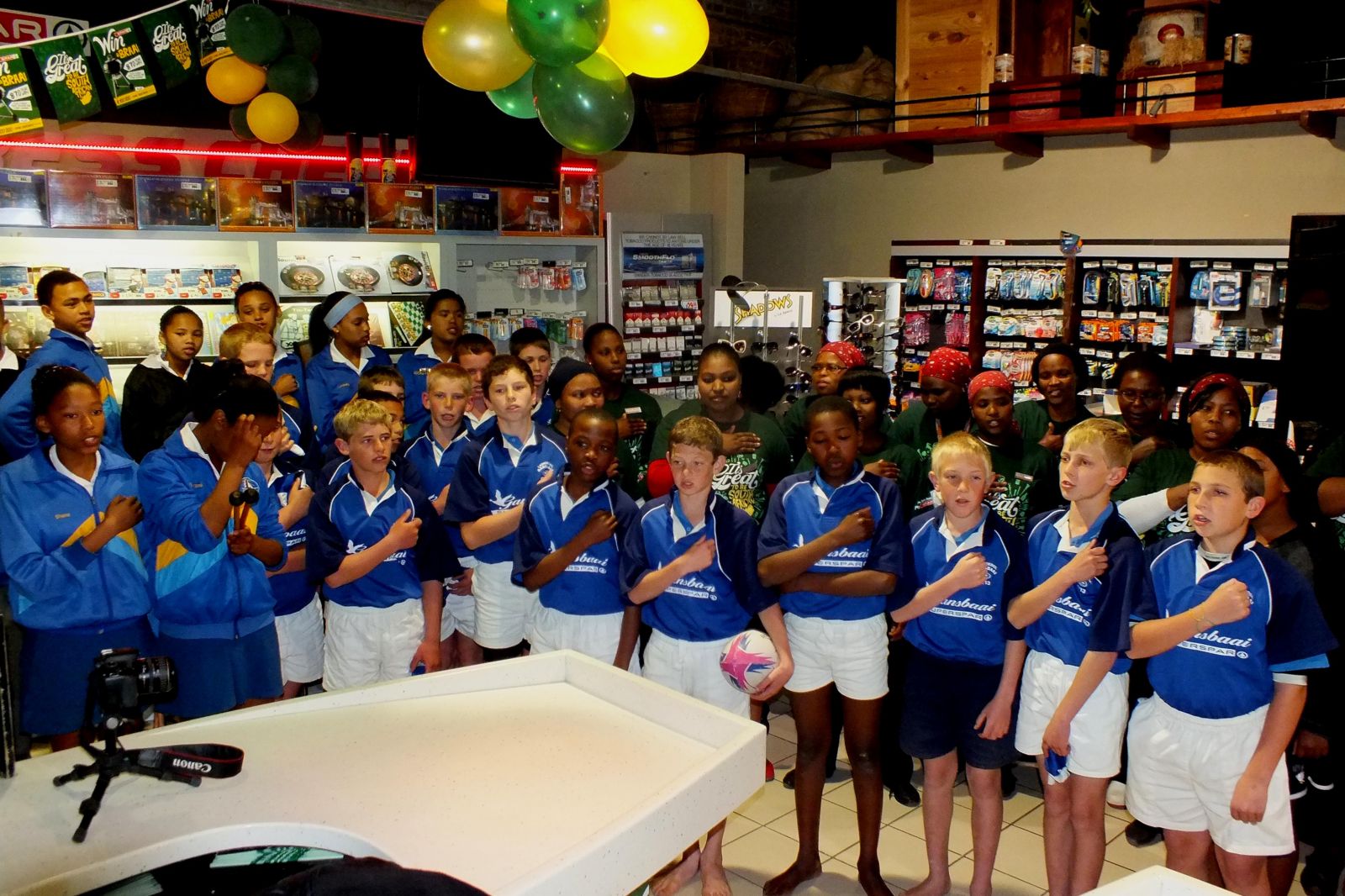 “Ons het ook ‘It’s great to be South African’ T-hemde gedurende die veldtog uitgedeel en ons winkel is verlede Vrydag beoordeel.” Riana hou graag die volgende bedankings (alfabeties) voor: Gansbaai Primêr (Marimba-orkes), Jeandre de Bod en Heinrich du Plessis (Fotograwe), Jurie Crous (Kitaarspel) en Laerskool Gansbaai (Netbal- en rugbyspanne).