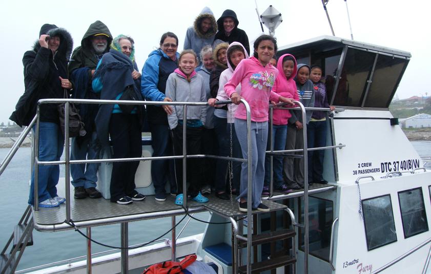 Ivanhoe Sea Safaris se boot - bietjie seesiekerig en kouerig in die reën, maar gevul met vreugde