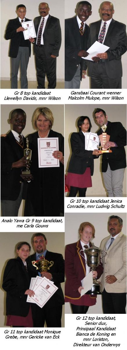 Die Junior meisie-dux het aan Janka Mans gegaan en die seun-dux aan Verreynne van Tonder. Die senior dux is Bianca de Koning wat ook die Kultuur trofee gewen het. Bianca is ook aangewys as die Prinsipaal – kandidaat. Die graad 8 top kandidaat was Llewellyn Davids wat ook akademiese erekleure ontvang het, graad nege het aan Analo Yawa gegaan, graad tien aan Jenica Conradie, graad elf aan Monique Grebe en graad twaalf aan Bianca de Koning.