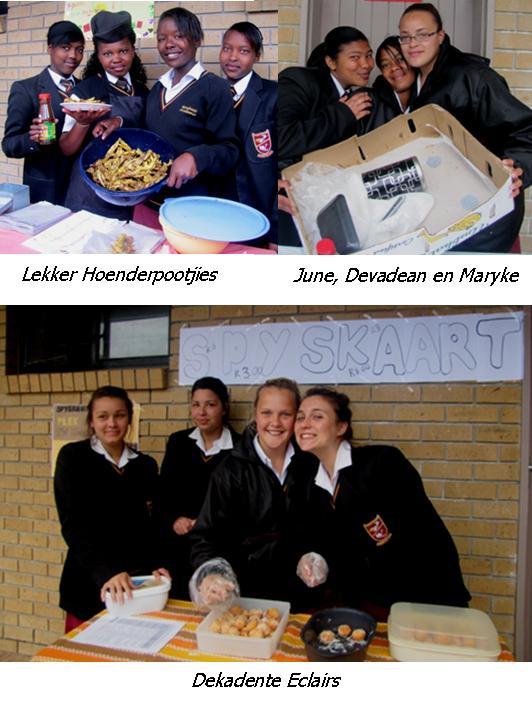 Donderdag 17 Oktober het die graad 11 Besigheidstudie leerders hul markdag gehou. Tussen die reënvlae en koue wind het die jong entrepreneurs hul slag gewys. Van dekadente eclairs, hoenderburgers, slaptjips, hoenderpootjies, samoosas en vele meer is verkwansel. Die wengroep was June Prins, Maryke Appel en Devadean Appel met hul hoenderburgers.