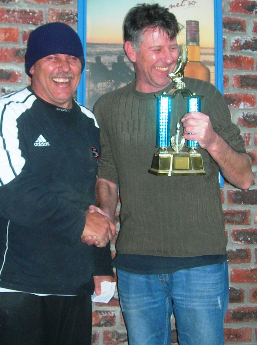Pearly Beach se Johan (Hippo) Snyman ontvang die trofee van Jaco van Alpha Rots- & Strandhengelklub