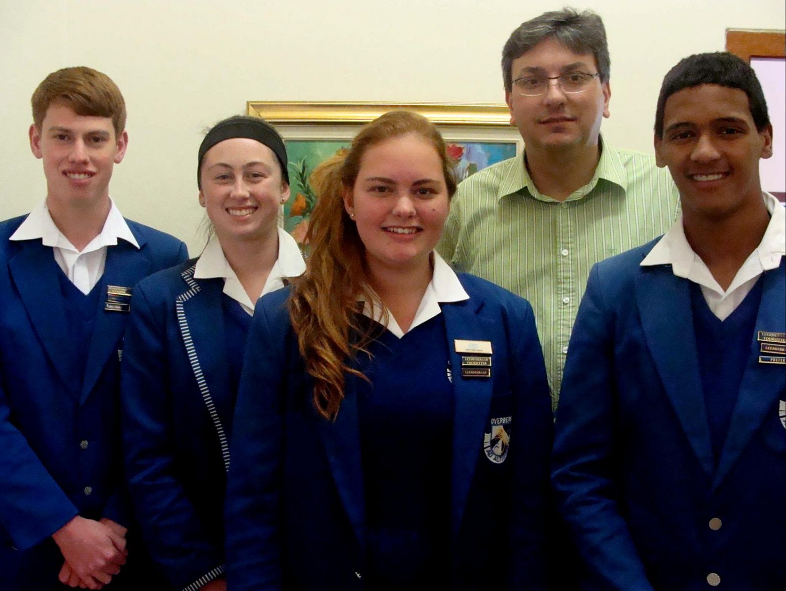 Hoërskool Overberg in Caledon se 2014-leiers, met vlnr Chad Kruger (onderhoofseun), Elani Matthee (onderhoofdogter), Ronel Holtzhausen (hoofdogter), Eddie Labuschagne (skoolhoof) en Keanu Makka (hoofseun)