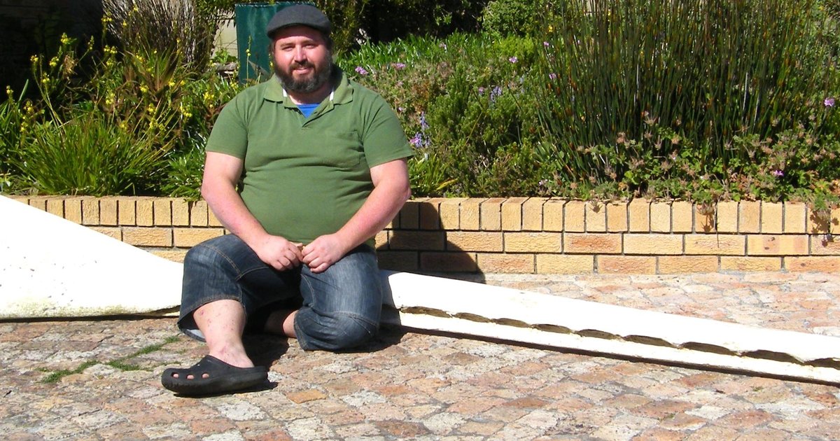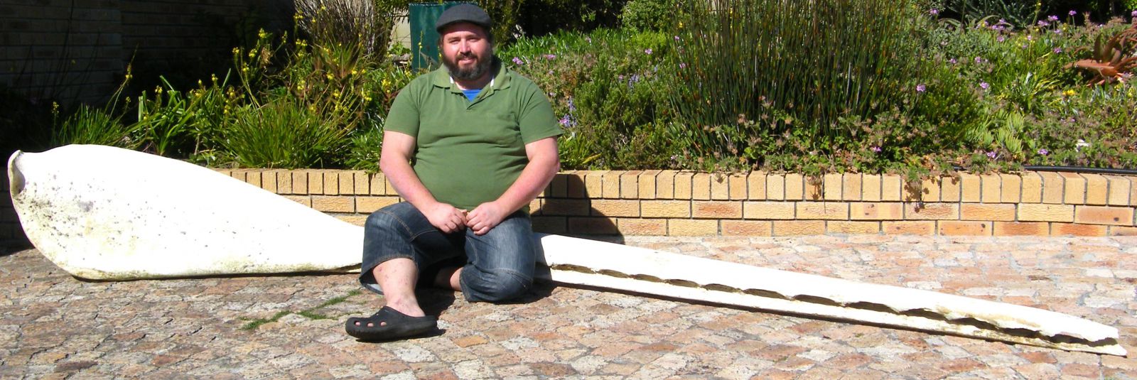 Danie de Lange sit hier op die onderkaak van ‘n spermwalvis wat hy by Gansbaai Getypoel uit die see gehaal het