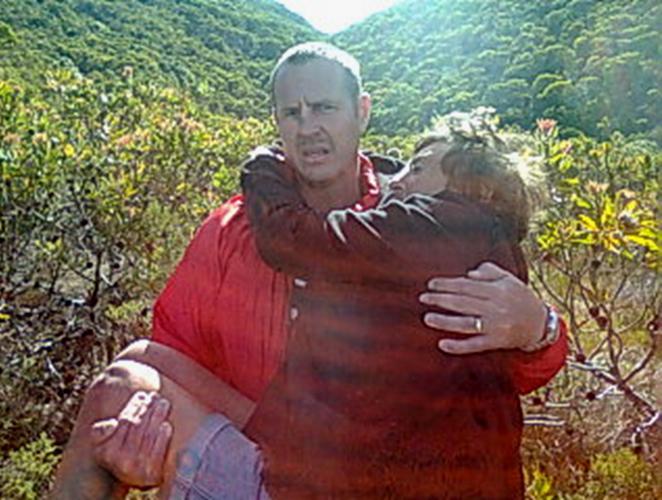 Sers Frans Groenewald dra Mathia Schwegler na veiligheid vanuit die kloof, waar sy vir ± 40 uur vermis was.