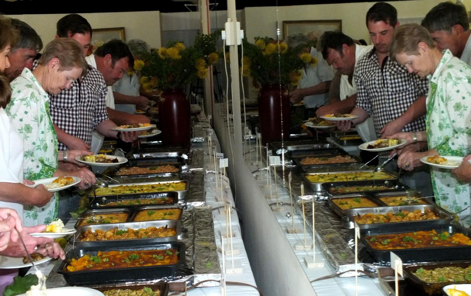 OMGEE Bedieninge se “Teelepel-ete” van Sondag, 10 November, het heelparty gaste verras - dis nou met die hoeveelheid kos wat met ‘n teelepel opgeskep kan word. Die groot verskeidenheid van geregte het natuurlik ‘n rol in die “byna oorvol” borde kos gespeel. “Ek het die spulletjie so bekyk en besluit om stilletjies twee teelepels te skep by die geregte wat ekstra lekker gelyk het, maar het my liederlik misgis met die oorvol bord waarmee ek verleë tafel toe moes stap,” het ‘n anonieme gas saggies vertel. Sowat 100 gaste het vir die interessante ete opgedaag en niemand is teleurgestel nie - nie met die oorgenoeg voedsel nie en nog minder met die aangename en gesellige samesyn. Sowat 18 smaaklike geregte is in twee rye uitgepak, met nagereg as die laaste opsie. Die geregte het gewissel vanaf bobotie met rys, verskillende vleise tot by groentes, pasta’s en slaaie - met roomys en vla waarmee afgesluit is.
