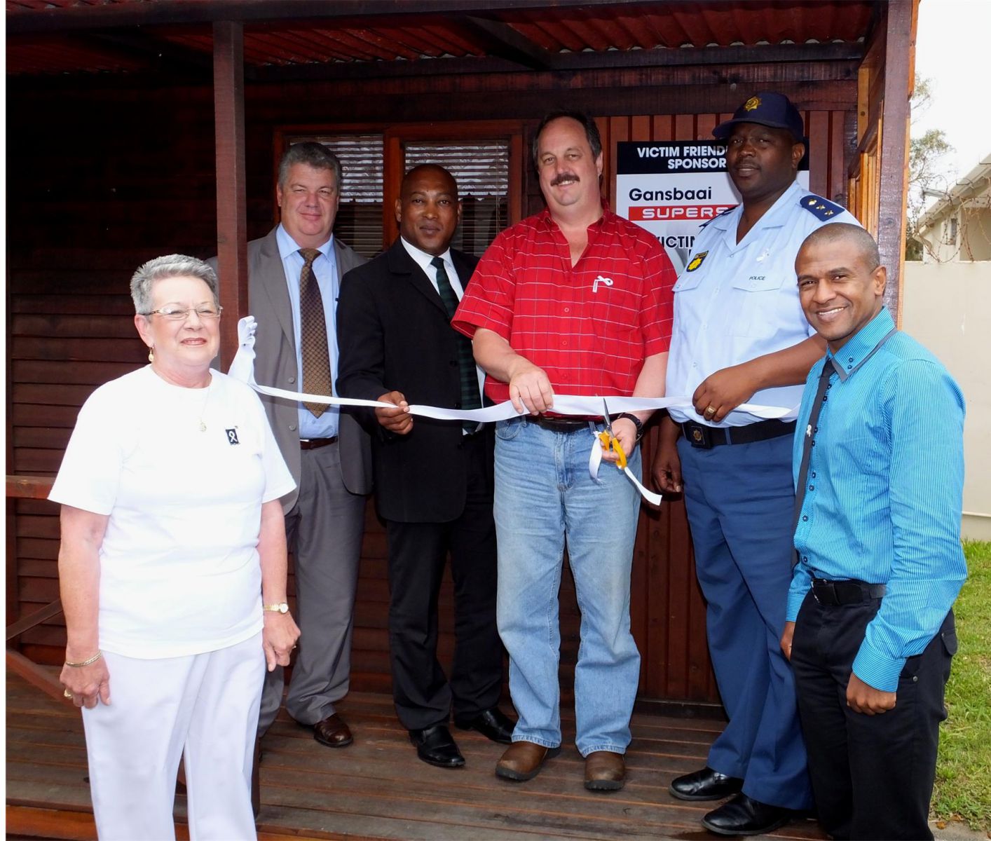 Bo: Vlnr: Lucille Mangiagalli, Kapt Danie Rautenbach (Gansbaai Stasiebevelvoerder), Shawn Koen ("Business Against Crime"), Morkel van Niekerk (Superspar), Kol P Cetyana (Hermanus Streek Bevelvoerder) en Lt Kol Paulse (Provinsiale SAPS Slagoffer Bemagtigings Program Koördineerder).