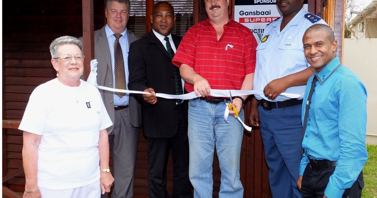 Bo: Vlnr: Lucille Mangiagalli, Kapt Danie Rautenbach (Gansbaai Stasiebevelvoerder), Shawn Koen ("Business Against Crime"), Morkel van Niekerk (Superspar), Kol P Cetyana (Hermanus Streek Bevelvoerder) en Lt Kol Paulse (Provinsiale SAPS Slagoffer Bemagtigings Program Koördineerder).