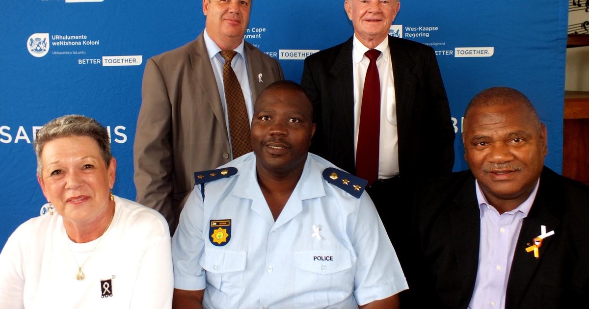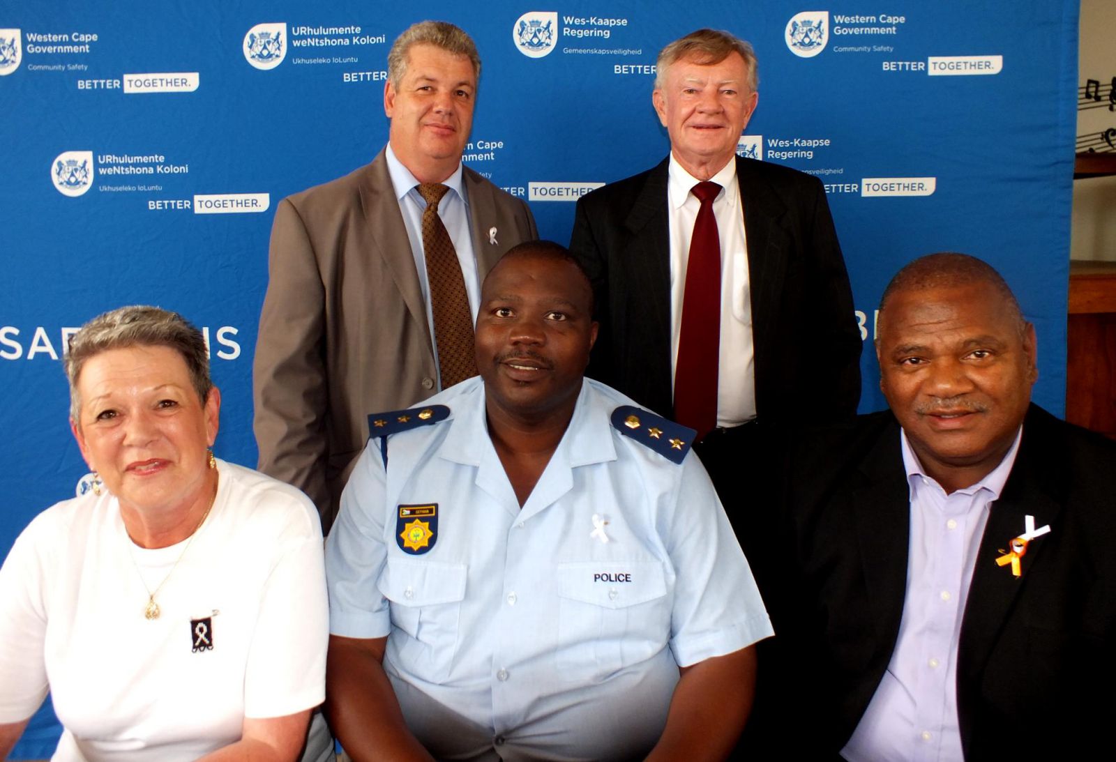 Voor vlnr is Lucille Mangiagalli, kol PV Cetyana en die Wes-Kaapse Minister van Gemeenskapsveiligheid, min Dan Plato. Agter vlnr is sp-kapt Danie Rautenbach, waarnemende stasiebevelvoerder van Gansbaai SAPD en rdh Pieter Scholtz, Overstrandse Onderburgemeester.