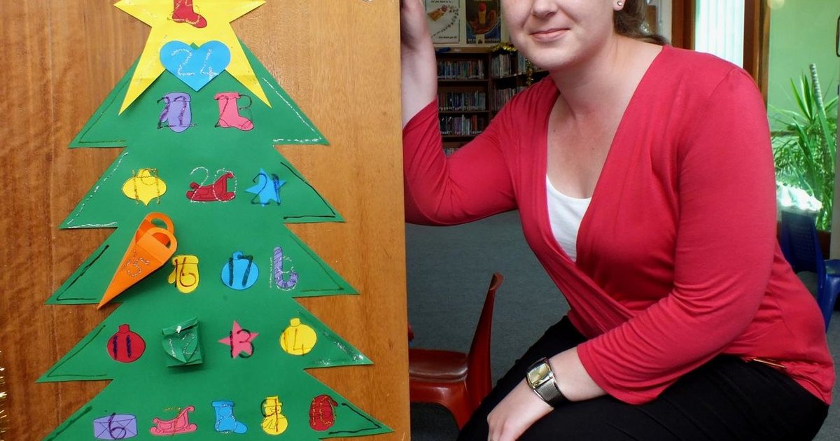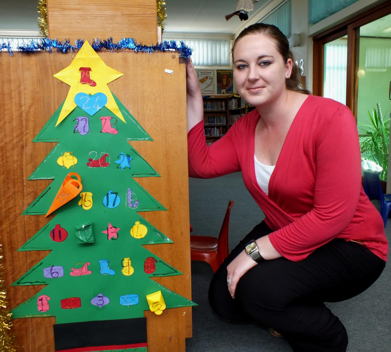 Edna van der Linde by die Advent Kalender wat sy self gemaak het, wat spesiale verrasssings vir kinders gedurende Desember inhou