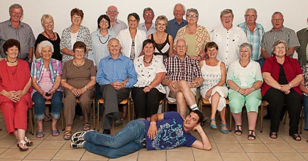 ‘n Groot deel van die NG-Koorlede tydens hul vrolike afsluitingsfunksie, met voor 5de van links hulle koorleidster, Aletta Lochner, met die koorkomitee se voorsitter, ds Stoney Coetzee langs haar en die koorbegeleier, Annelene Reinke, langs hom. (Foto: Lientjie Venter)