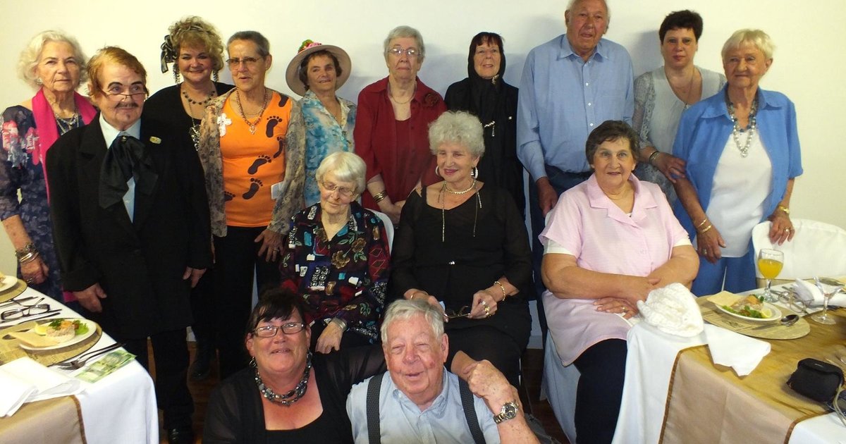 Gansbaai Seniorklub se lede tydens hul jaareindfunksie wat spoggerig vir ‘n foto poseer, met Angela Caie voor links