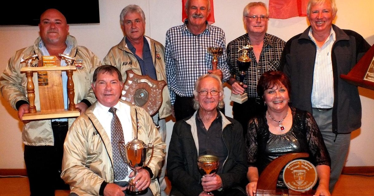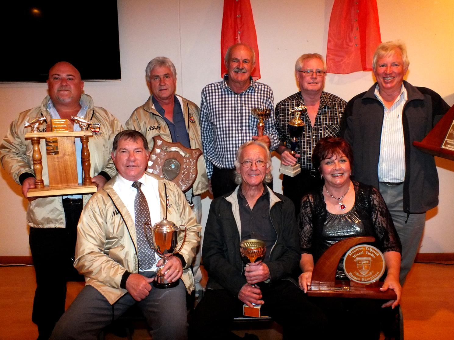 ‘n Deel van die trofeë- en sertifikaatwenners van die Birkenhead Boothengelklub, met voor vlnr Philip Fourie, Raymond Rabe en Elna van Zyl. Agter vlnr is Gawie Krugel, Johan Burmeister, Jean Downing, André Hattingh en Piet van Zyl