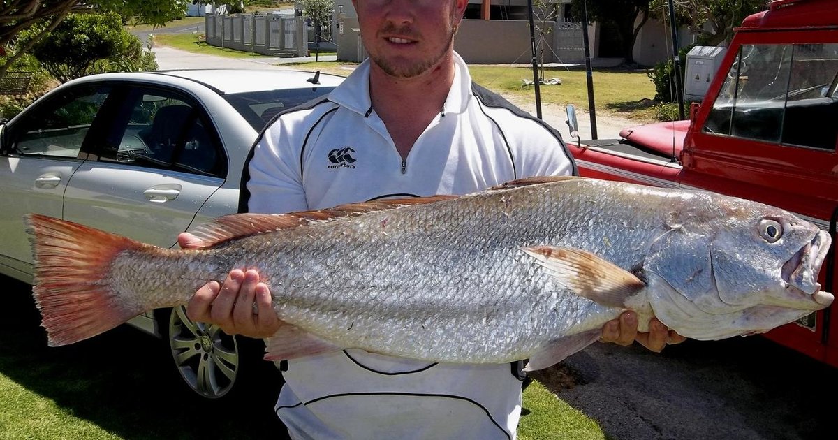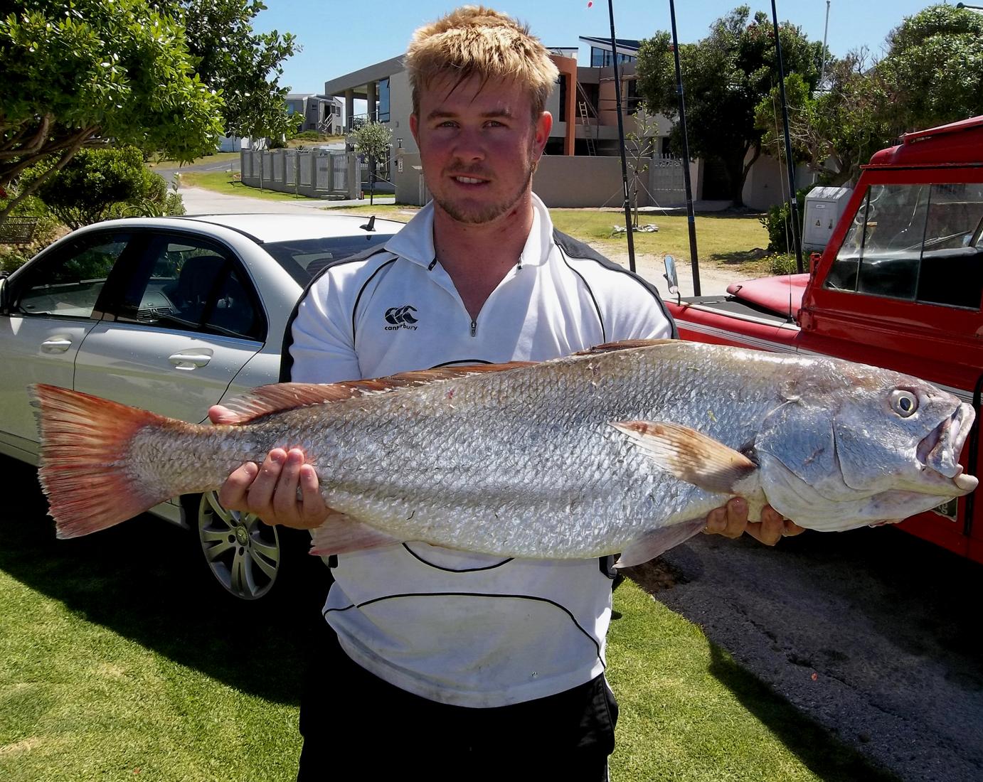 Die foto hiermee is net vir die lekkerkry. Die kêrel is ook ‘n besoeker aan ons kus en kon die versoeking nie weerstaan om met die mooi kabeljou te spog wat nog vars uit die water is nie. Hierdie kabeljou is sommer hier naby ons gevang en hoewel hy nie self hierdie bielie ingebring het nie was hierdie knewel vir hom meer aanvaarbaar as sy eie vangs vir die foto. En jy kan mos ook probeer.