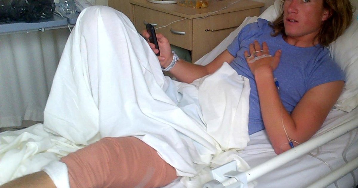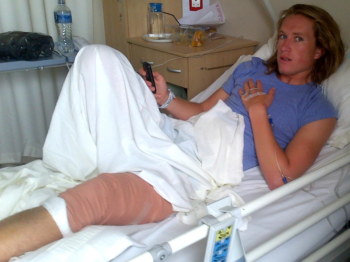 Thomas Brown sterk in die Mediclinic by Hermanus aan nadat hy deur 'n Grootwithaai by De Kelders Plaat aangeval is (die sirkel toon aan waar dit gebeur het).
