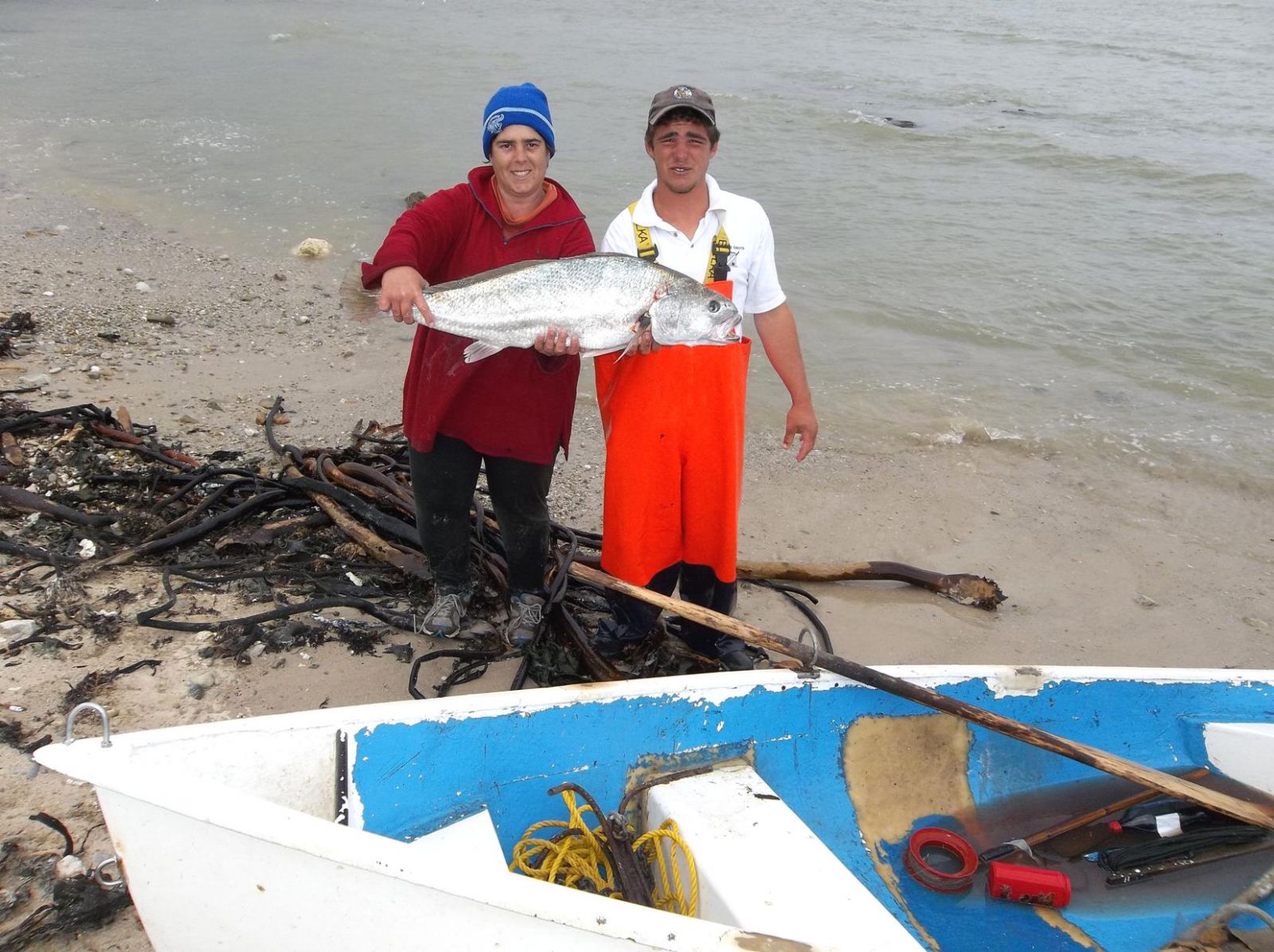 Dis ma Marinda Groenewald wat hierdie bielie van ‘n kabeljou by Haaiklip gevang het. Seun Brandon help vashou. So lyk ‘n amperbootjie.