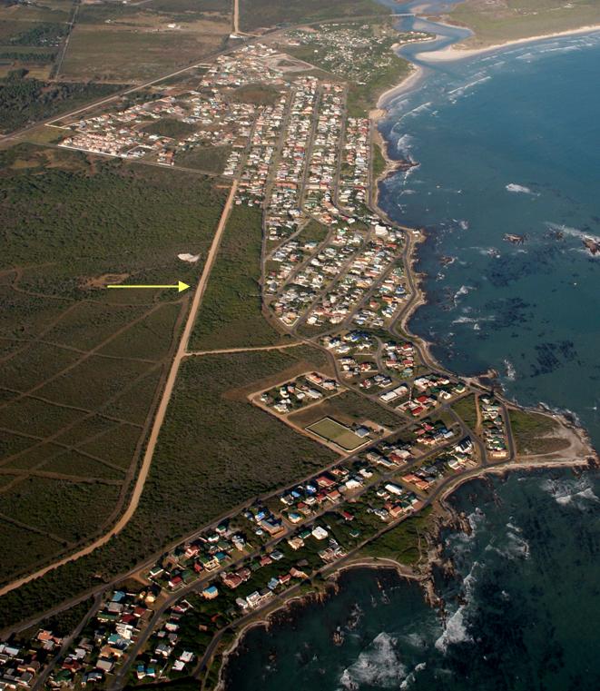 Die pyl dui die verbypad agter Franskraal en Kleinbaai op die lugfoto aan.