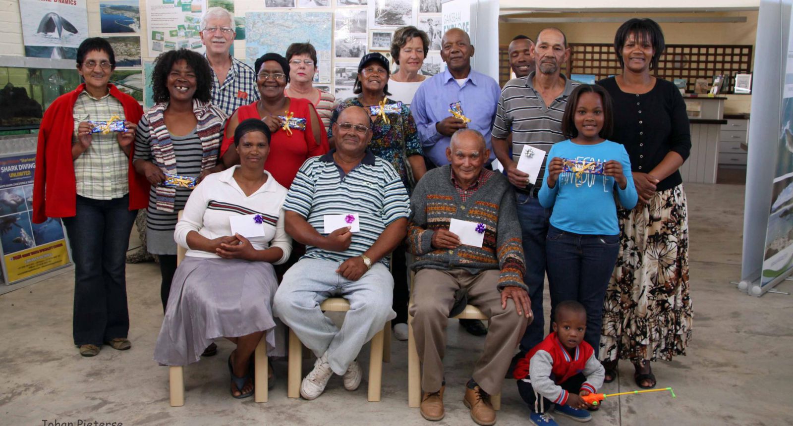 Die deelnemers aan Gansbaai Toerisme se Tuinboukompetisie, met heelagter vlnr Johan Pieterse (voorsitter), Glenda Kitley (bestuurder), Gina Boysen en Katriena Adams heel regs, met “Oom” Freek (2de) links van haar. Voor (middel) sit Johnny Dyk (1ste) tussen die 3de prys-delers Nettie Kapot en Piet Temmers. . (Foto: Johan Pieterse)