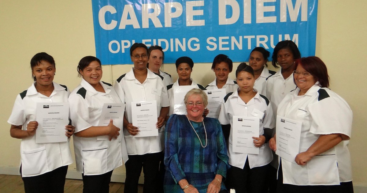 Vanjaar se Tuisversorgingsstudente van Carpe Diem Opleiding Sentrum in Caledon, onder die leiding van Suster Iréne de Waal, spog met suksesverhale en is onlangs met sertifikate beloon. “Die sentrum lei werkloses op en tydens hul opleiding word daar spesifiek onder andere aandag aan die versorging van veral bejaardes met dimensie en altzheimer gegee,” vertel Suster de Waal. Sy sê hierdie Tuisversorgers is in staat om katetersorg, buisvoeding en volledige bedsorg aan pasiënte te verskaf.