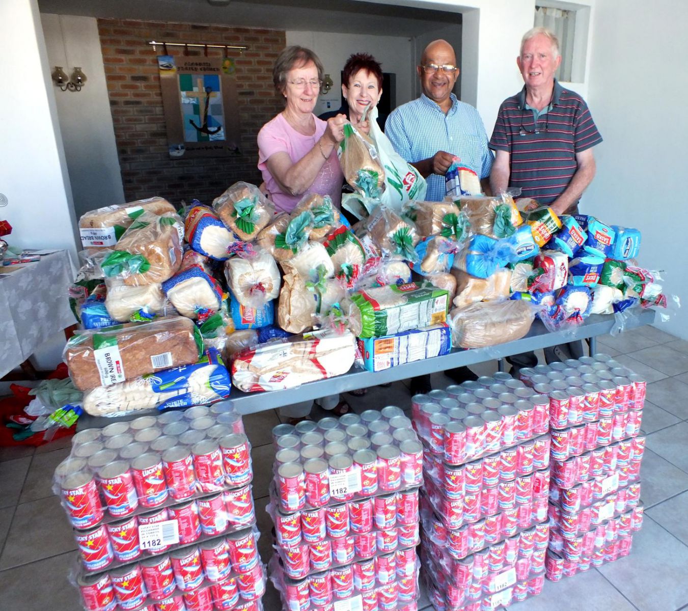 Links en regs is twee van die organiseerders, Jill en John Collings, met van die eerstes wat brood- en visbestellings kom afhaal het, Ena Geldenhuys (Tuisversorging) en past Ronnie Dyk (AGS-Ebenhaezer) agter die vis en brood wat uitgedeel is