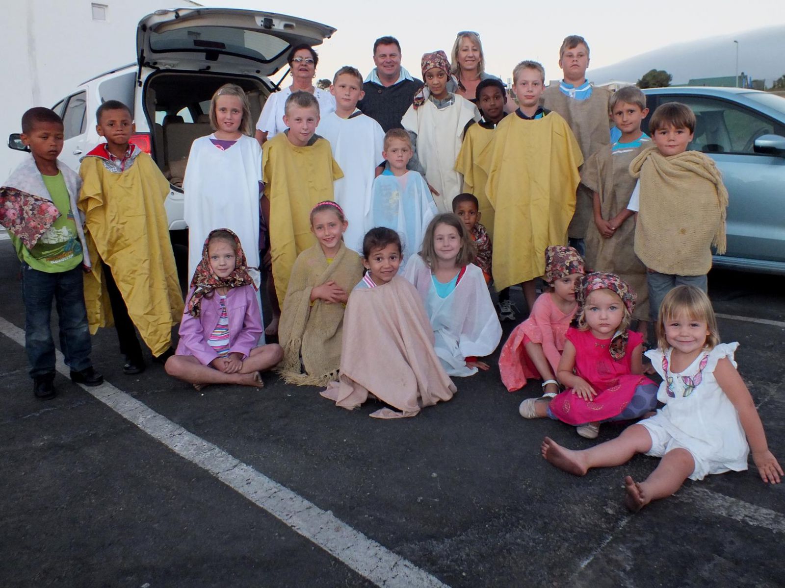 Die voorsangers was weer die bekende Dirk en Eva Büchner, Mike Schröder en Adri Ehlers, asook past Beryll Coetzer, met Elize Schröder agter die klankstelsel. Ivy van Huyssteen van Gansbaai Lions het al die kinders bymekaar laat kom en hulle van interessante los “Bybelse kledingstukke” en kopdoeke (wyse manne, skaapwagters en engele) voorsien wat hulle opgewonde kon aantrek. Hulle het vir die res van die byeenkoms stroopsoet voor langs die voorsangers gaan sit, met natuurlik lekkergoed wat deur “Tannie Ivy” uitgedeel is.