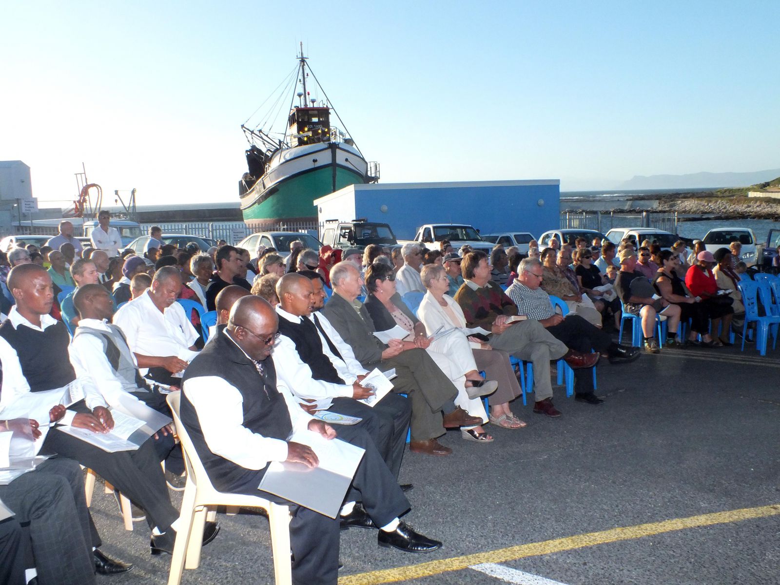 ‘n Deel van die goeie opkoms van mense by die onlangse Vissermans Verootmoedigingsdiens in Gansbaai Hawe, met die Christelike Mannekoor Blompark links