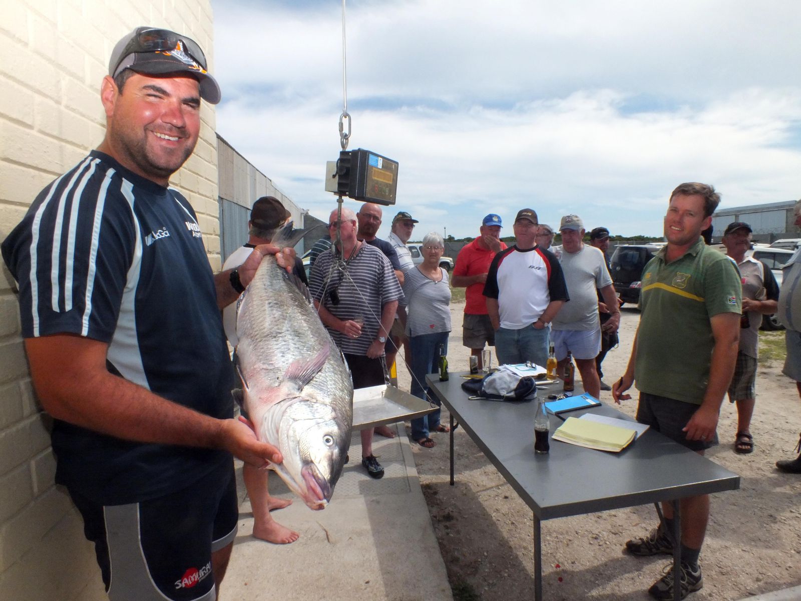 “Die manne is vroegdag, 6-uur, see toe en ek verstaan daar was van die skippers wat baie rondgevaar het en dit was moeilik vir sommiges om 1kg visse te kry.” Lyne is teen 16:00 op-getrek en die skaal was reeds vanaf 15:00 beskikbaar. Riaan sê hulle was verras deur die aantal mooi Wit Steenbras wat ingeweeg is, veral toe Bev Swart van die BBK sy Wit Steenbras van 5.3kg eerste kom inweeg wat hulle die voortou laat neem het. Daarna het die Birkenheaders ‘n Roman van 1.35kg en ‘n Kabeljou van 1.8kg skaal toe gebring, maar hulle voorsprong is daarna verbygesteek.