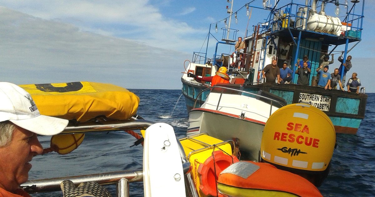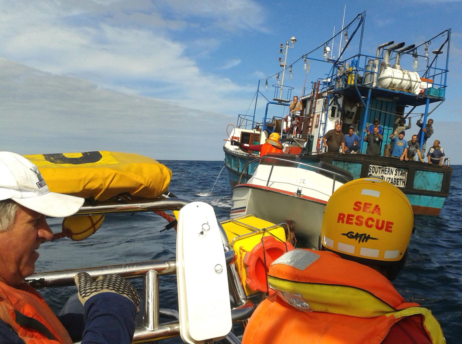 Voor is seereddingsbeamptes op hul boot en agter is dit die Southern Star, met My China van Eldo Marais in die middel